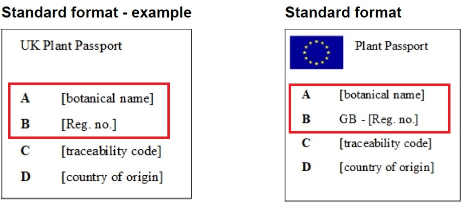 Part A and Part B are highlighted in the boxes below. Note the distinction between the proposed UK Plant Passport (left) to be used from 1st January 2021 and the current EU Plant Passport (right).