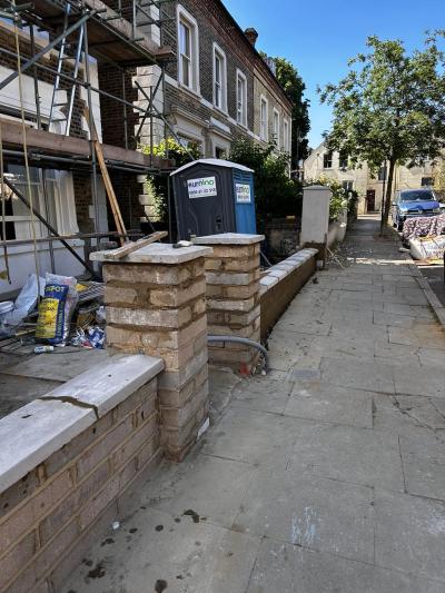 We transformed the front and back gardens, including side access, using a blend of natural materials. For the back garden, tumbled mint sandstone was paired with reclaimed London yellow bricks for raised beds and fresh turf. The front garden features Same sandstone, complemented by a restored Victorian mosaic tile path and a newly replaced gate. The result is a stylish, functional outdoor space that combines classic charm with modern design.