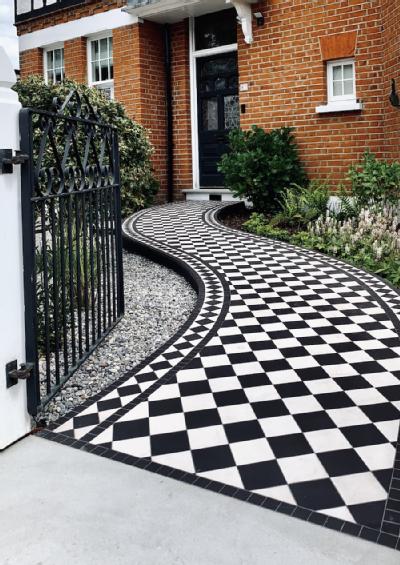This front garden in Highgate N6 included the construction of a traditional Victorian tiled path in an Oxford pattern.