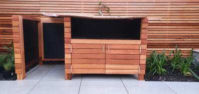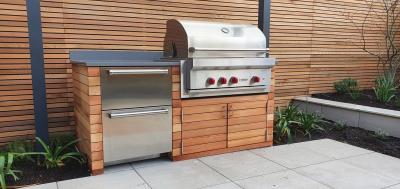 A bespoke outdoor kitchen with BBQ and stainless-steel fittings, designed for alfresco dining.