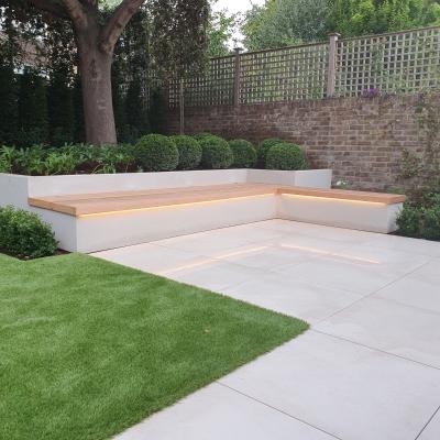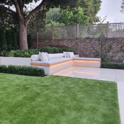 This contemporary garden showcases a perfect balance of style and function. Clean porcelain paving and lush green lawns create structure, while soft, layered planting adds texture and privacy. A bespoke built-in seating area with integrated LED lighting offers a welcoming space for relaxation, framed by elegant hedging and mature trees. The sleek outdoor dining area with modern furniture provides the ideal setting for entertaining. Combining precision hard landscaping with vibrant greenery, this garden demonstrates Limestone Landscapes’ expertise in crafting timeless, versatile outdoor living spaces.