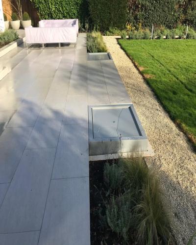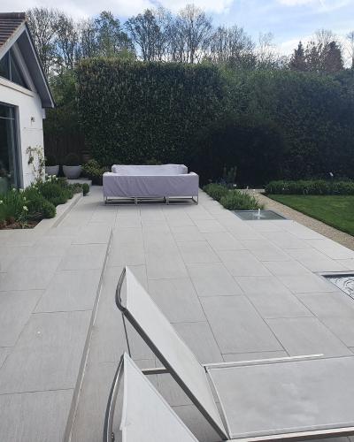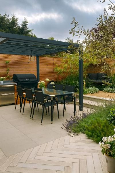Stylish porcelain paving and herringbone detailing, adding texture and visual interest to the patio.
