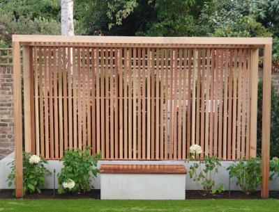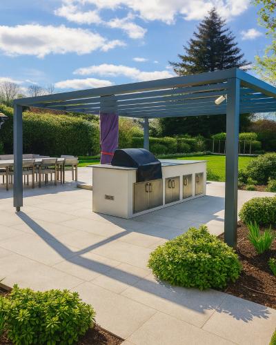 A sleek pergola structure providing shade and architectural definition to the dining area.