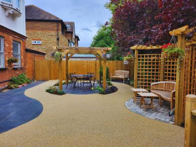 Using a mixture of materials we used Paving, Resin, Oak and created this beautiful space