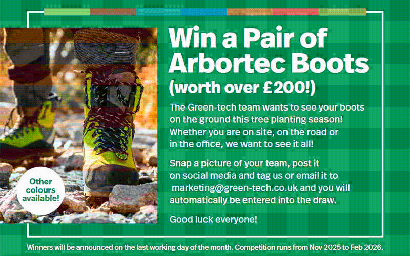 To mark the start of this year’s season, Green-tech has launched a competition offering the chance for four people to win a pair of premium Arbortec boots worth over £200. One winner will be drawn each month from November 2025 until February 2026.